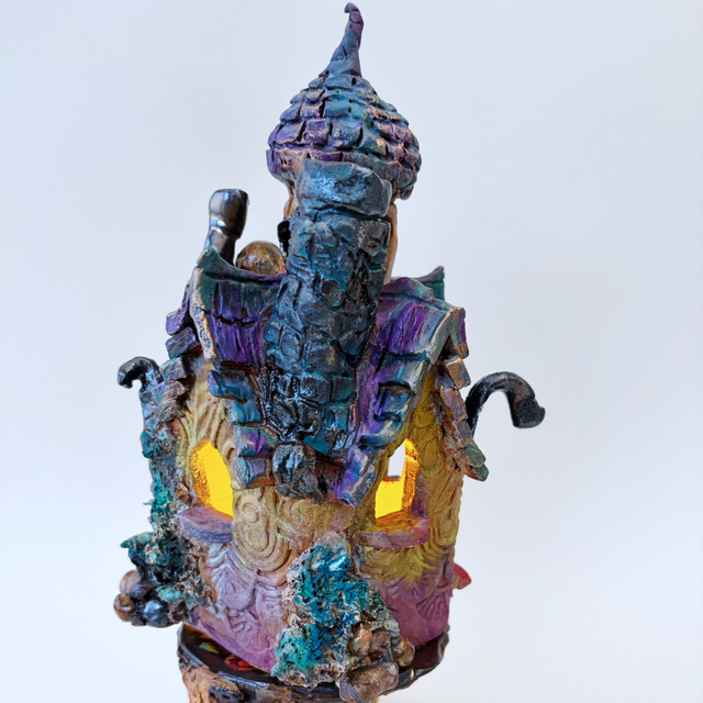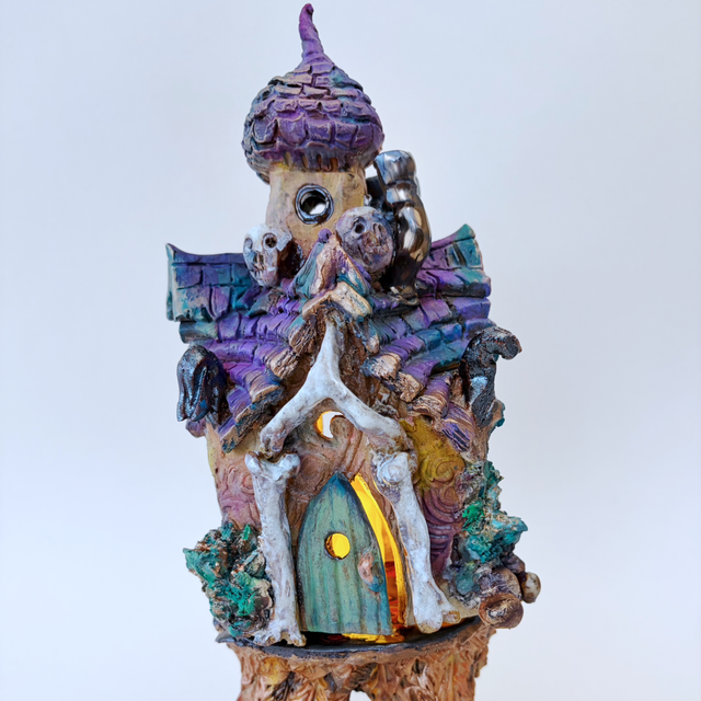 Stoneware sculptural hut in two pieces inspired by Slavic folklore, made to function as a luminary with a tealight inside if wished. Finished in stoneware glazes and cold finishes. Lift the hut from the base to place a tealight or battery powered light inside.