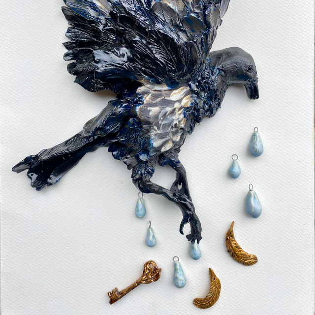 I was intrigued by the rhyme about magpies that begins ‘one for sorrow, two for joy’ and wanted to explore the idea of someone holding your feelings, and giving space to explore grief. A keeper of porcelain tears and soft sentiments, a golden key.